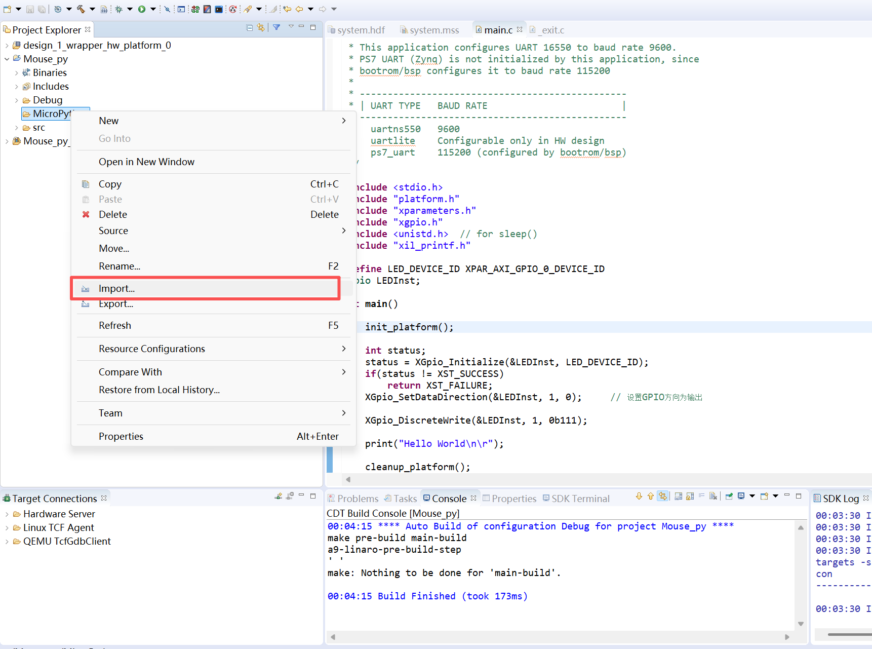 /* * helloworld.c: simple test application * * This application configures UART 16550 to baud rate 9600. * PS7 UART (Zynq) is not initialized by this application, since * bootrom/bsp configures it to baud rate 115200 * * ------------------------------------------------ * | UART TYPE BAUD RATE | * ------------------------------------------------ * uartns550 9600 * uartlite Configurable only in HW design * ps7_uart 115200 (configured by bootrom/bsp) */